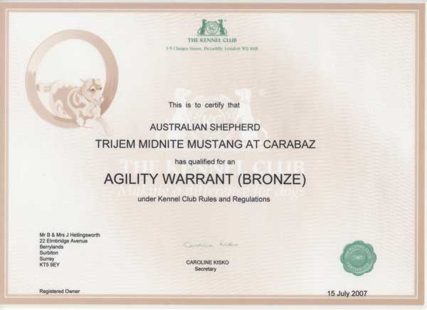 Rio obtained his AGILITY WARRENT Bronze AW(B) award September 2007