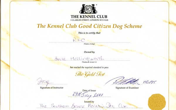 He obtained his 'Gold Good Citizen' award (see below right)